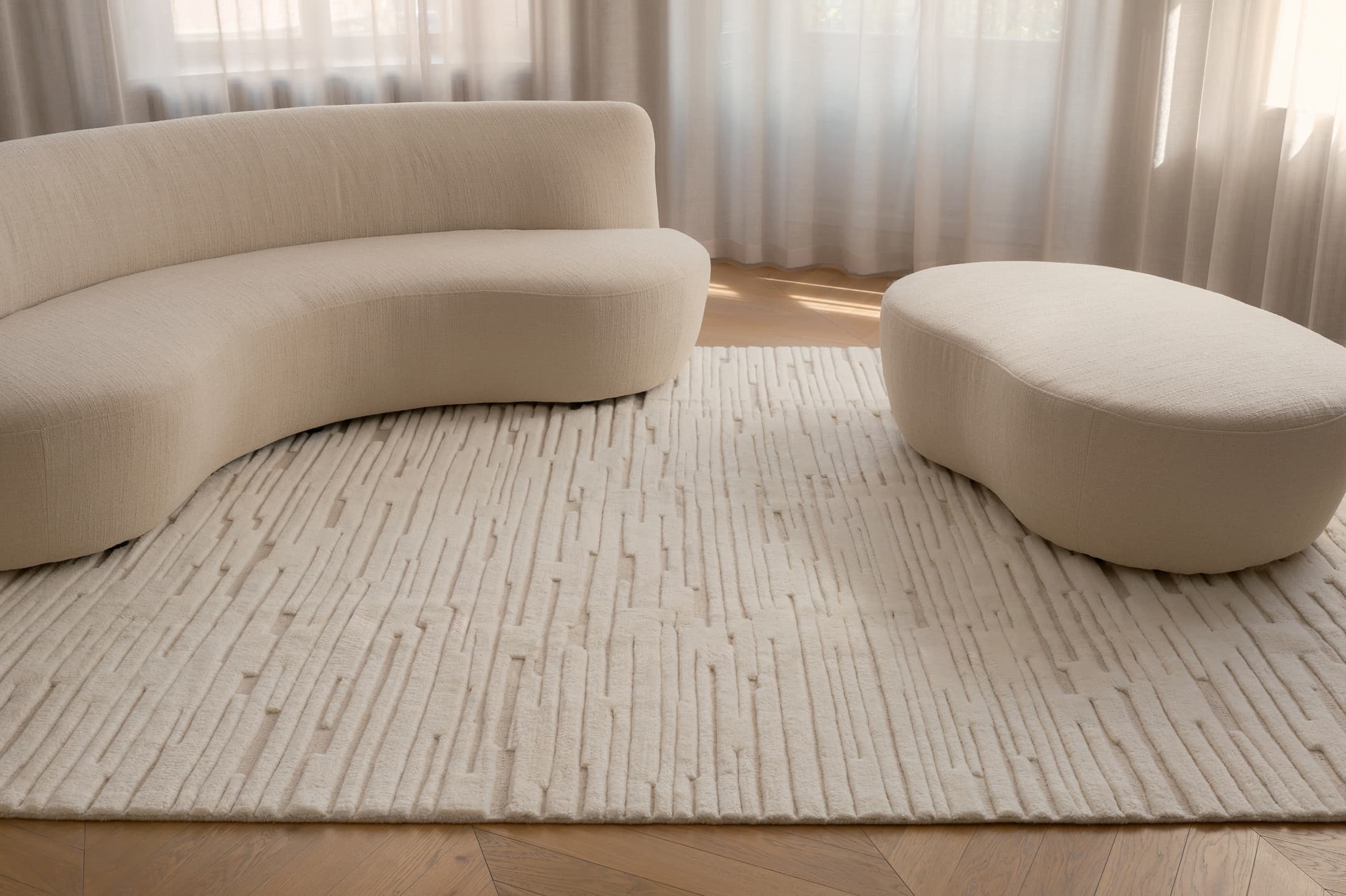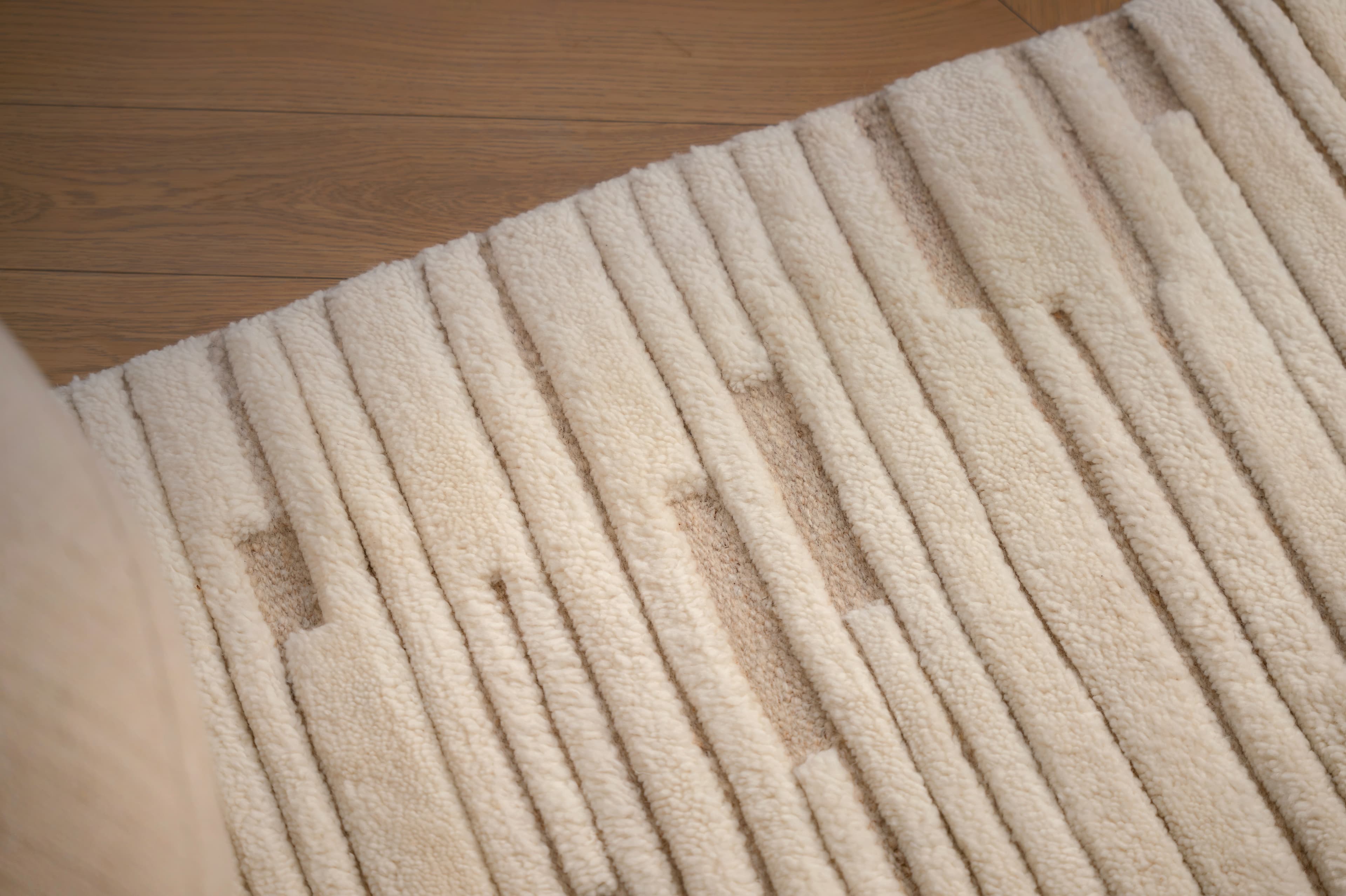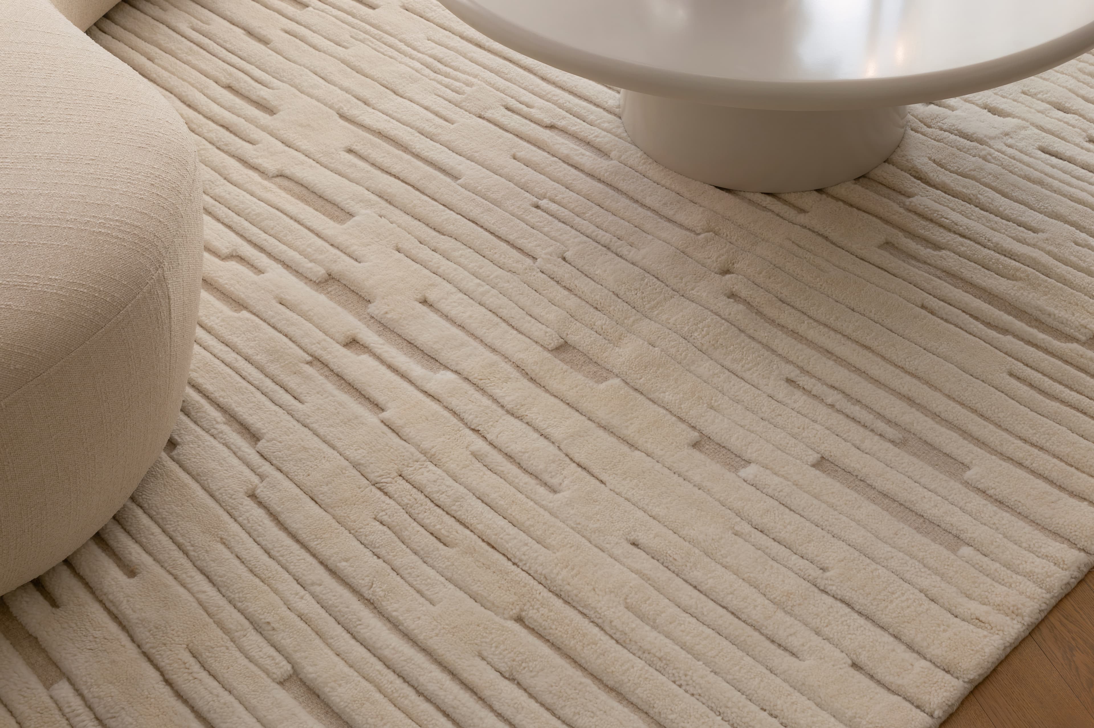 Chloe Ullmatta White/Natural från Sleepo Collection är en exklusiv handvävd ullmatta tillverkad i 100% naturlig ull. Den skulpturala ytan utmärks av ett ton-i-ton-mönster i vitt och naturfärgat som ger ett elegant och harmoniskt intryck. De upphöjda linjerna skapar ett subtilt tredimensionellt spel över mattans yta, vilket förstärker den taktila upplevelsen och tillför djup till rummet utan att ta över.