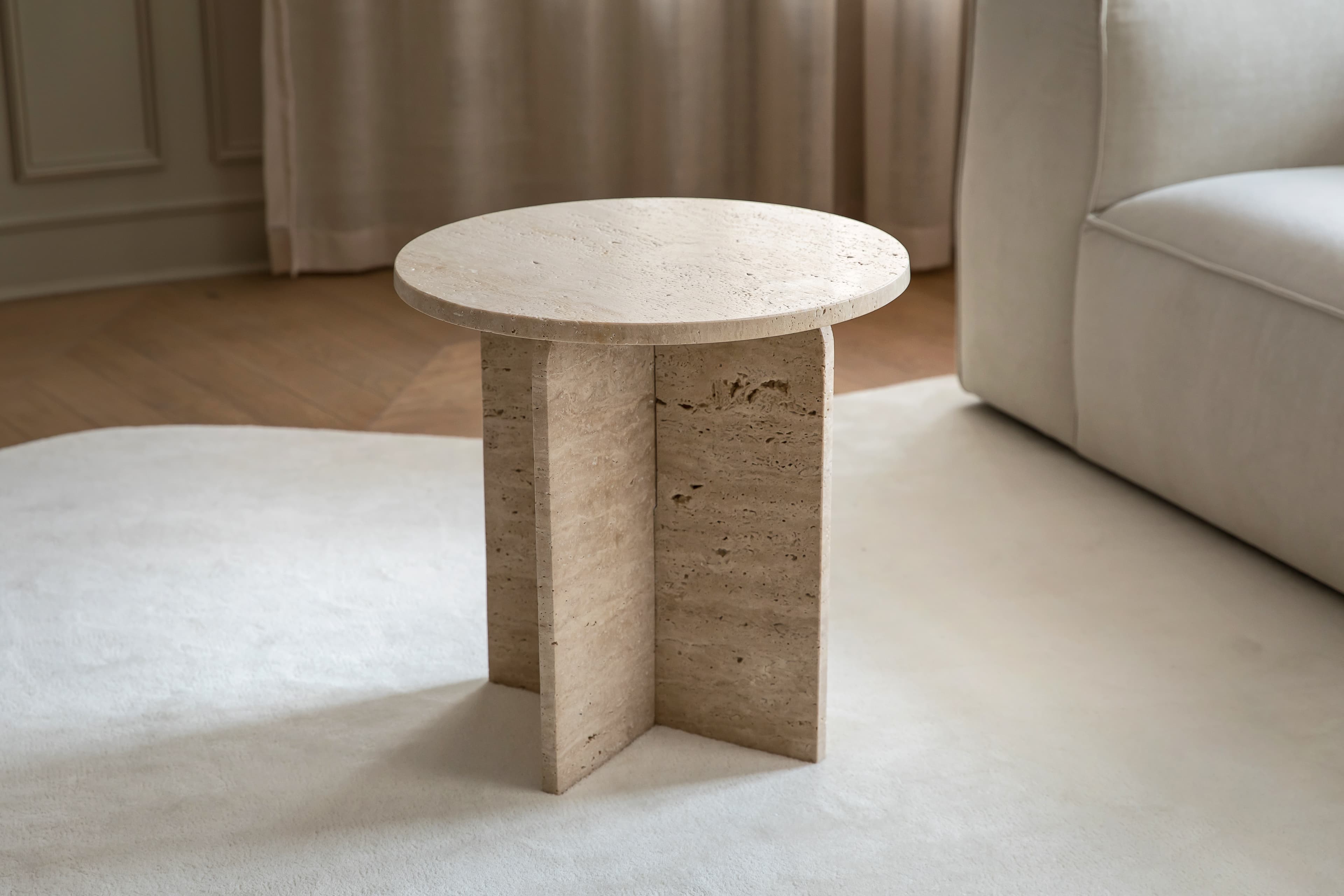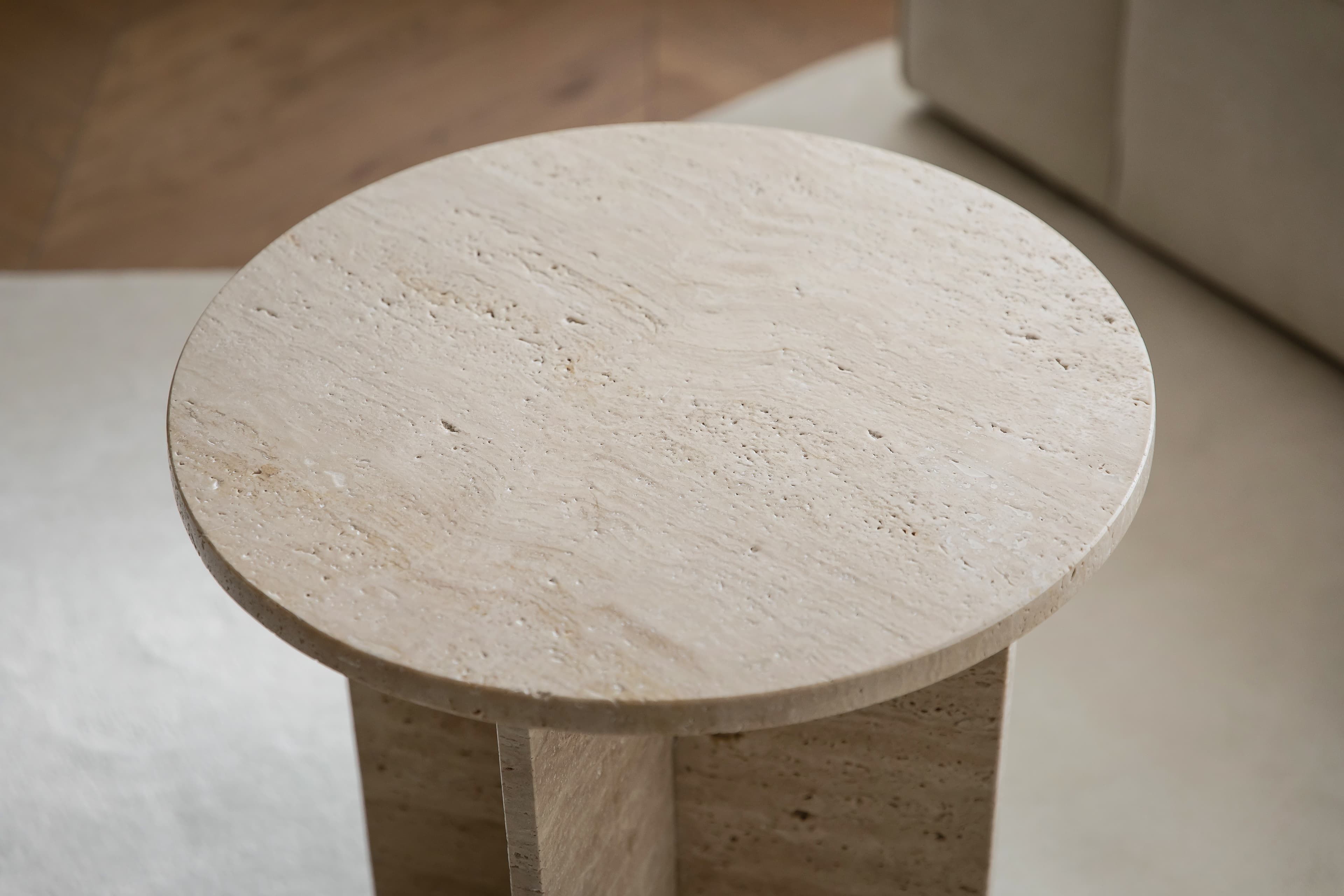 Travis är ett imponerande sidobord i vacker, solid travertin sten. Bordet har en rund form med mjuka kanter och hörn. Bordet vilar på en plus-formad fot som ger bordet ett mer intressant uttryck. Det vackra travertin-materialet skiftar i nyanser av beige, sand och naturvitt som varierar från bord till bord. Kombinera gärna med soffbordet ur samma serie.
