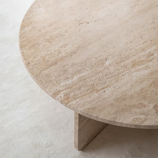 Travis är ett imponerande soffbord i vacker, solid travertin sten. Bordet har en rund form med mjuka kanter och hörn. Bordet vilar på en plus-formad fot som ger bordet ett mer intressant uttryck. Det vackra travertin-materialet skiftar i nyanser av beige, sand och naturvitt som varierar från bord till bord. Kombinera gärna med sidobordet ur samma serie.