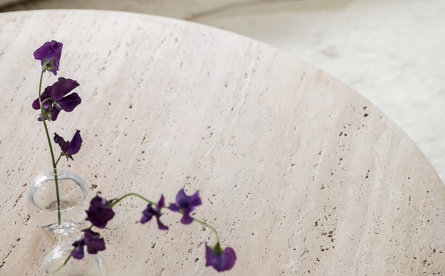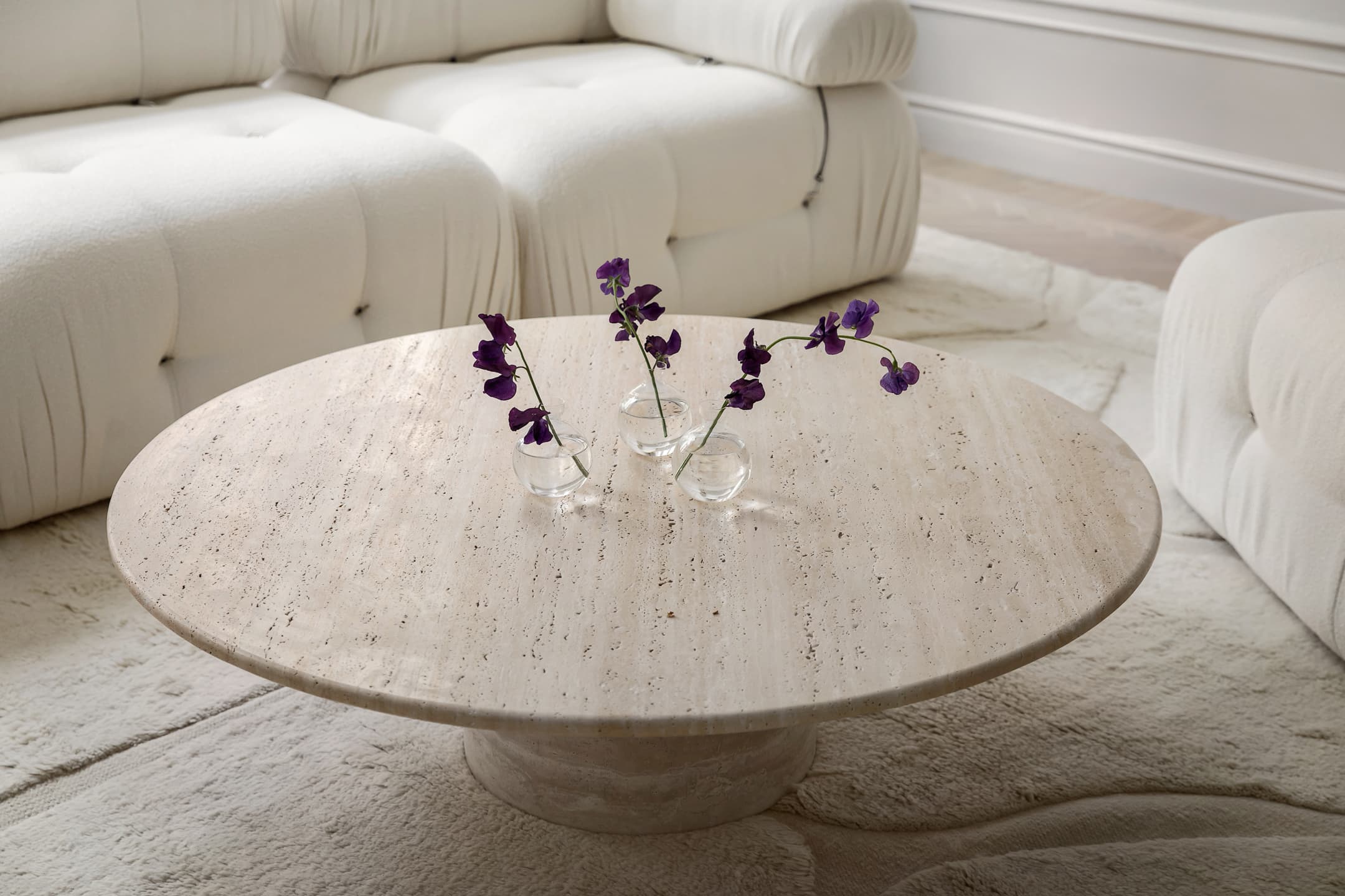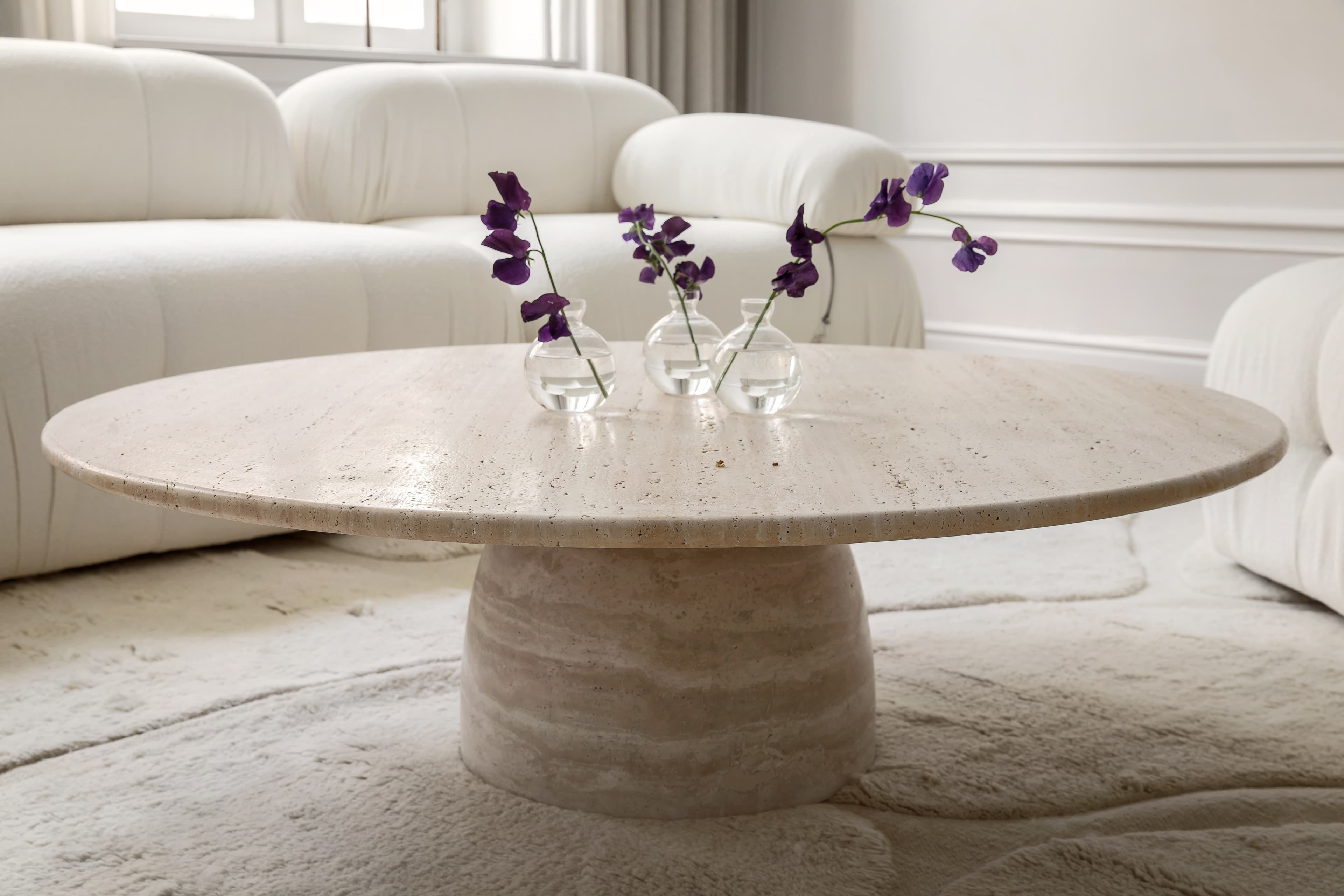 Nicola är ett magiskt fint soffbord i vacker, solid travertin sten. Bordet har en rund form med mjuka kanter och hörn. Bordet vilar på en rundad fot som som avsmalnar närmare bordsskivan. Det vackra travertin-materialet skiftar i nyanser av beige, sand och naturvitt som varierar från bord till bord. Med Nicola får du ett soffbord som blir mittpunkten i varje vardagsrum.