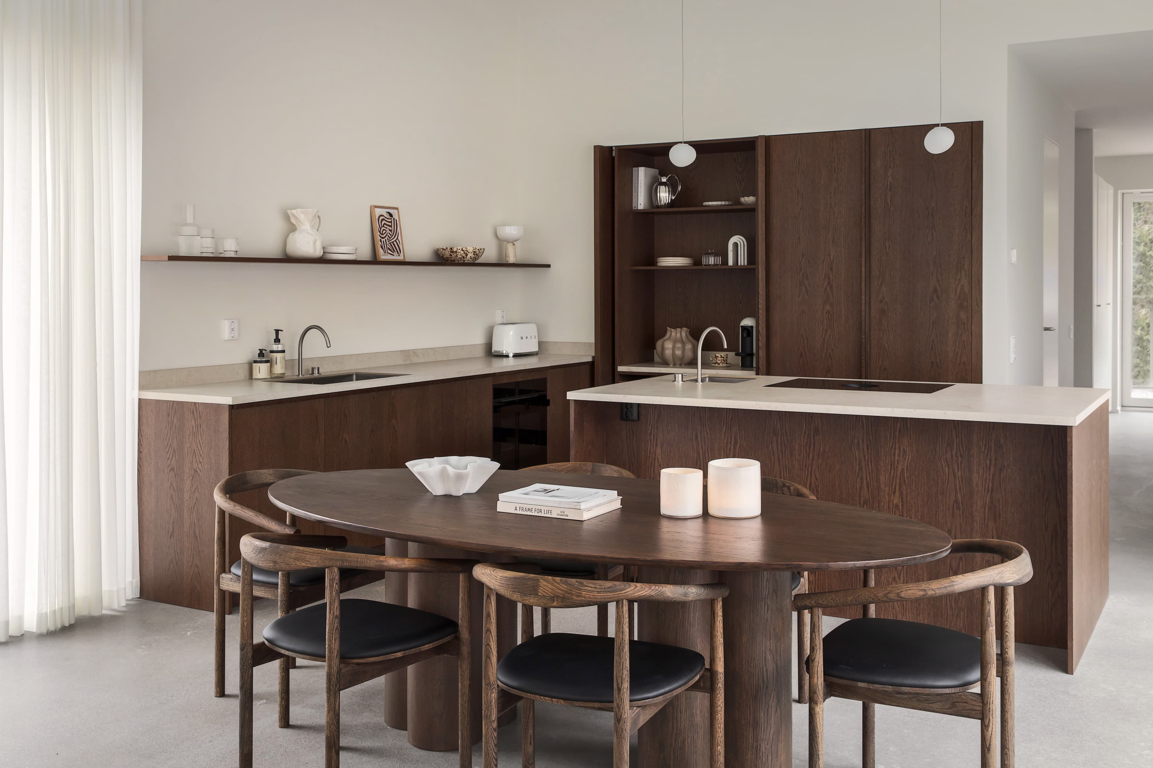 Emmas hem är ljust och härligt tack vare bra ljusinsläpp, ljusa gardiner, mattor och möbler. Det ljusa bryts även av med mörka trädetaljer som det brunbetsade matbordet och matstolarna som smälter in perfekt i Emmas fina kök. Kombinationen av beige och mörkt trä är helt fantastiskt fint!!