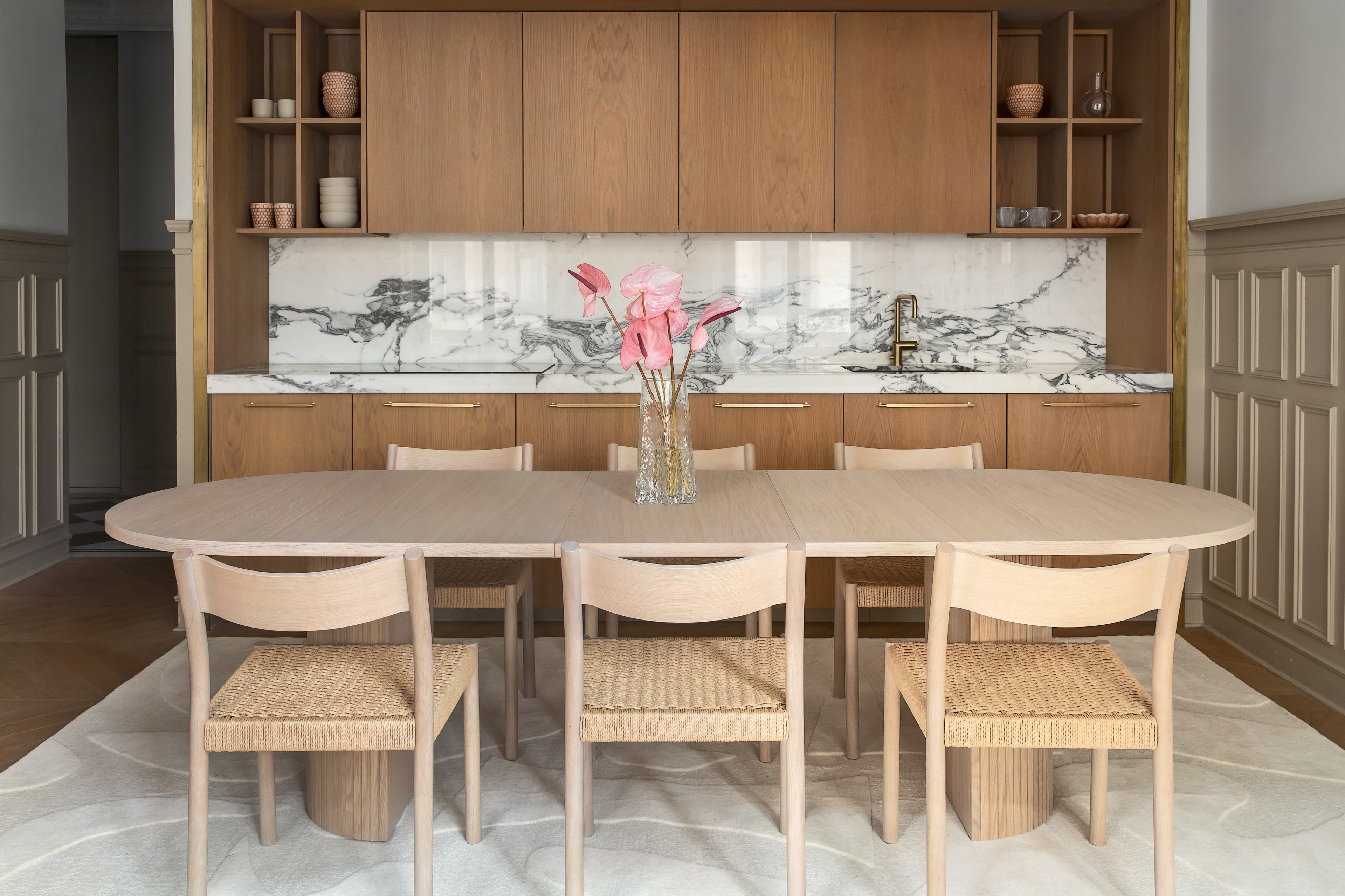 Välj ett ovalt förlängningsbart matbord om du vill ha en unik form och samtidigt kunna utöka ytan vid behov. Det ovala bordet ger en mjukare och mer inbjudande känsla samtidigt som det behåller den funktionalitet och flexibilitet som krävs för stora middagar eller familjesammankomster.